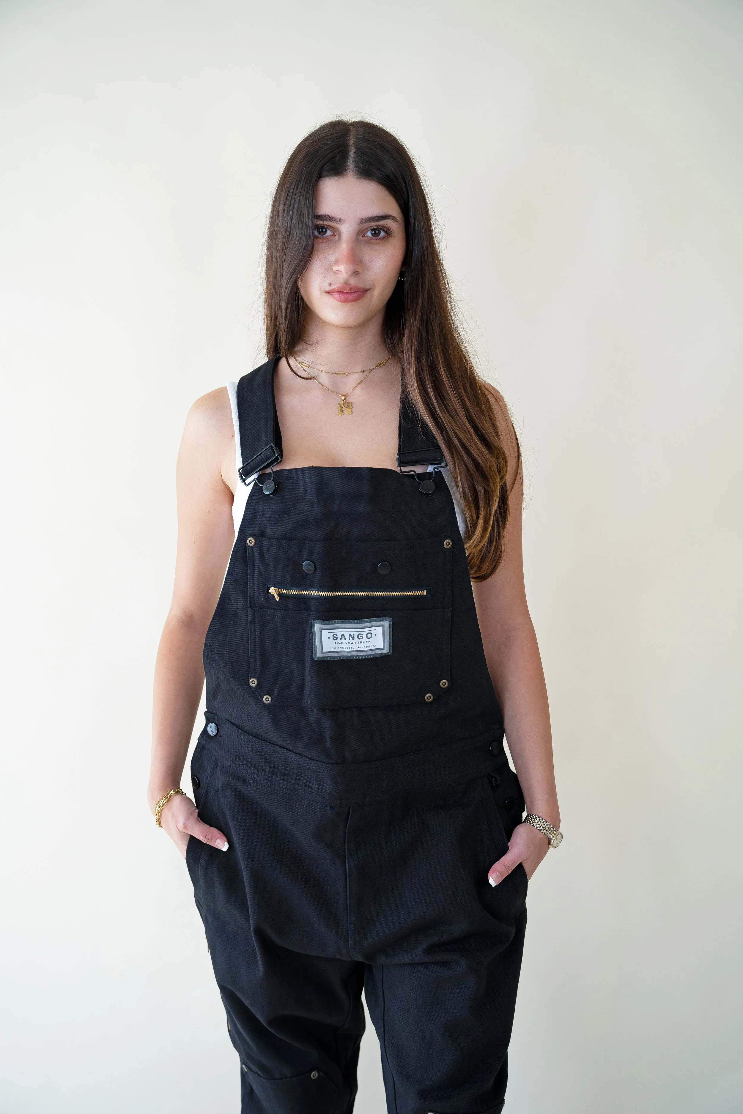 Person wearing black overalls with a front pocket, zipper, and adjustable shoulder straps, over a white hoodie with orange drawstrings, standing against a plain white background.
