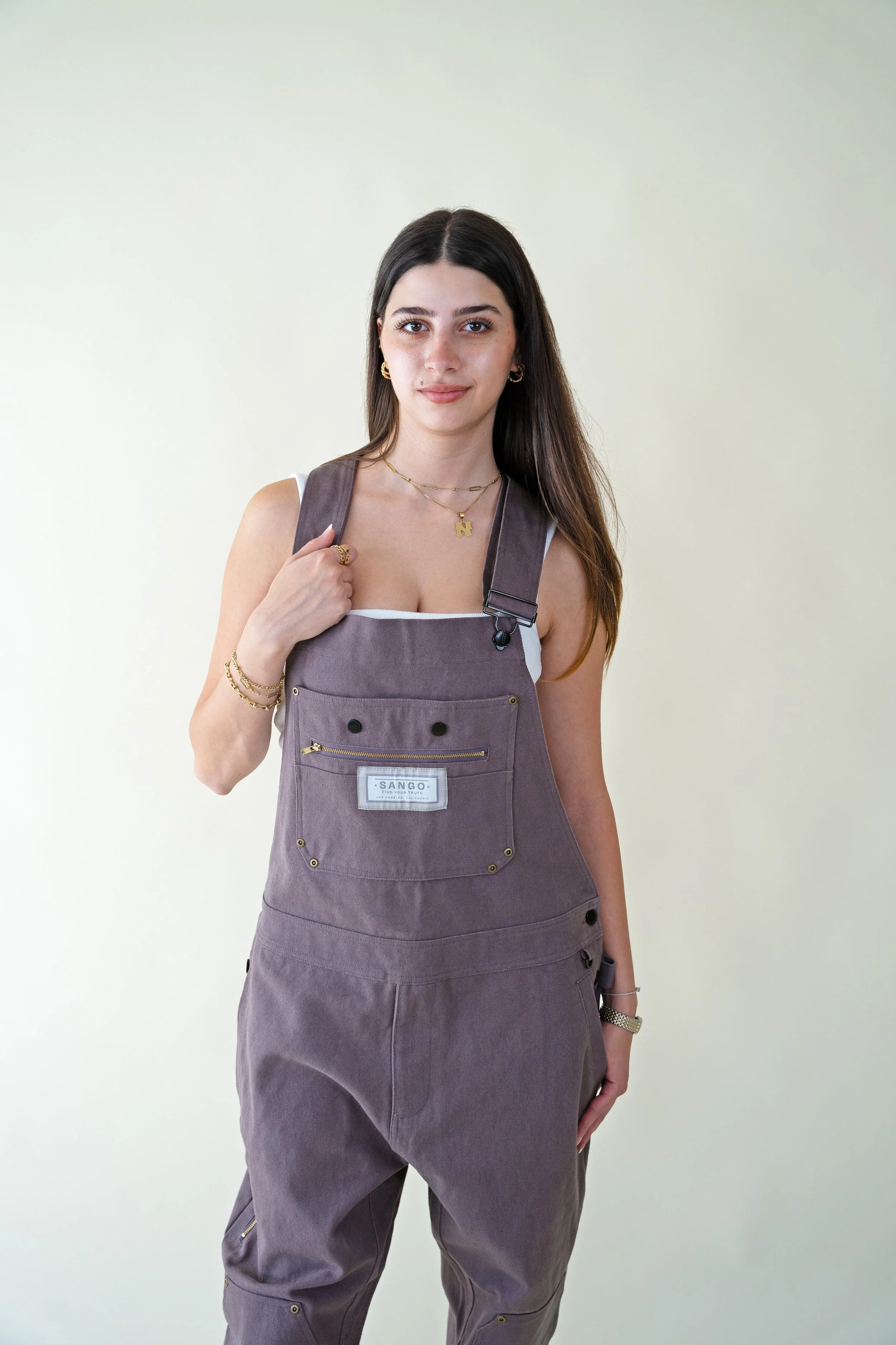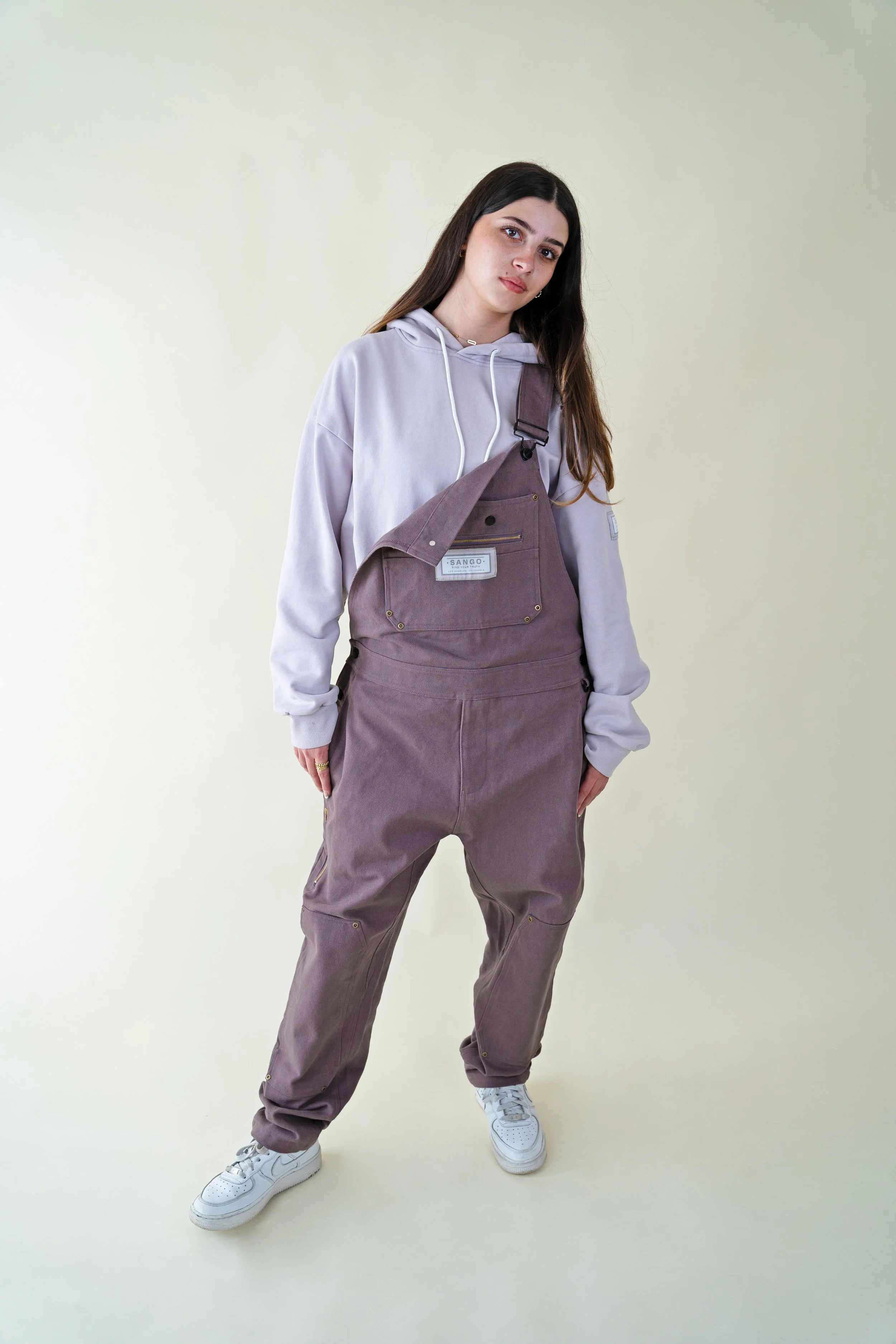Person wearing a gray hoodie and mauve overalls, with hands in pockets, standing against a light background. View fullsize