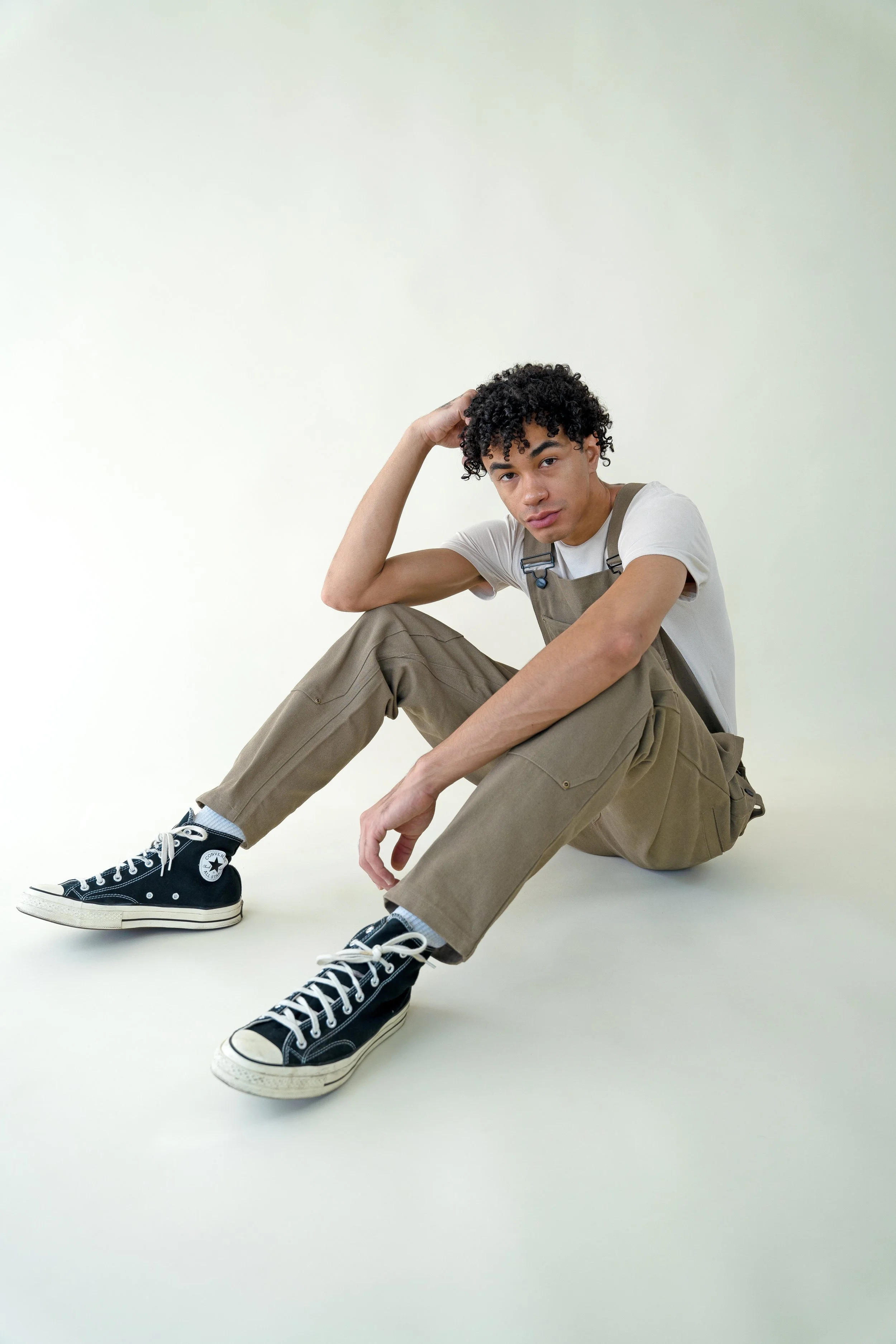 Young man with curly hair sitting on the floor, wearing a beige t-shirt, khaki pants, and black high-top Converse sneakers, against a plain light-colored background.