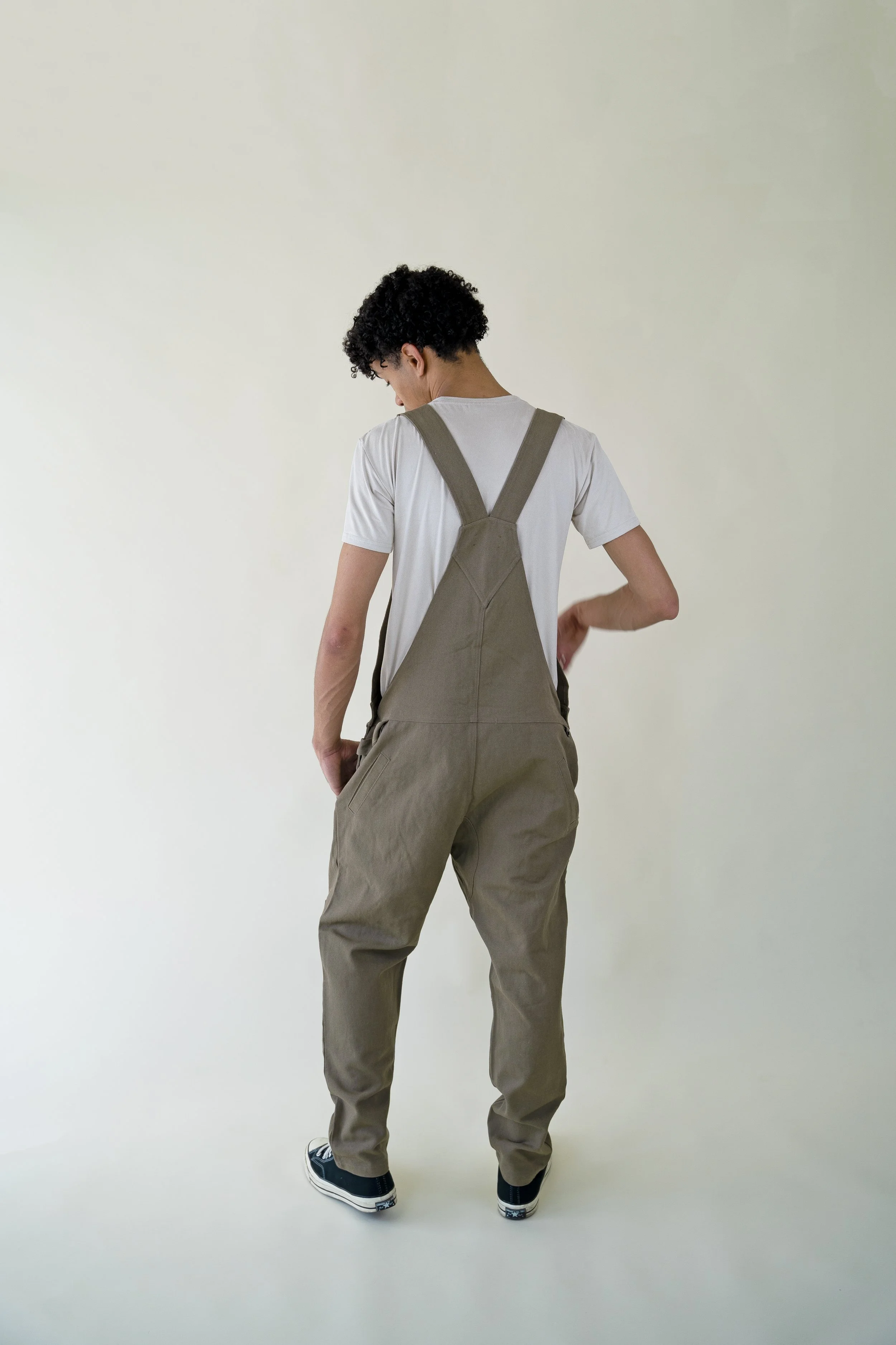 Person standing with their back to the camera, wearing a white t-shirt, beige overalls, and black sneakers, against a plain white background.