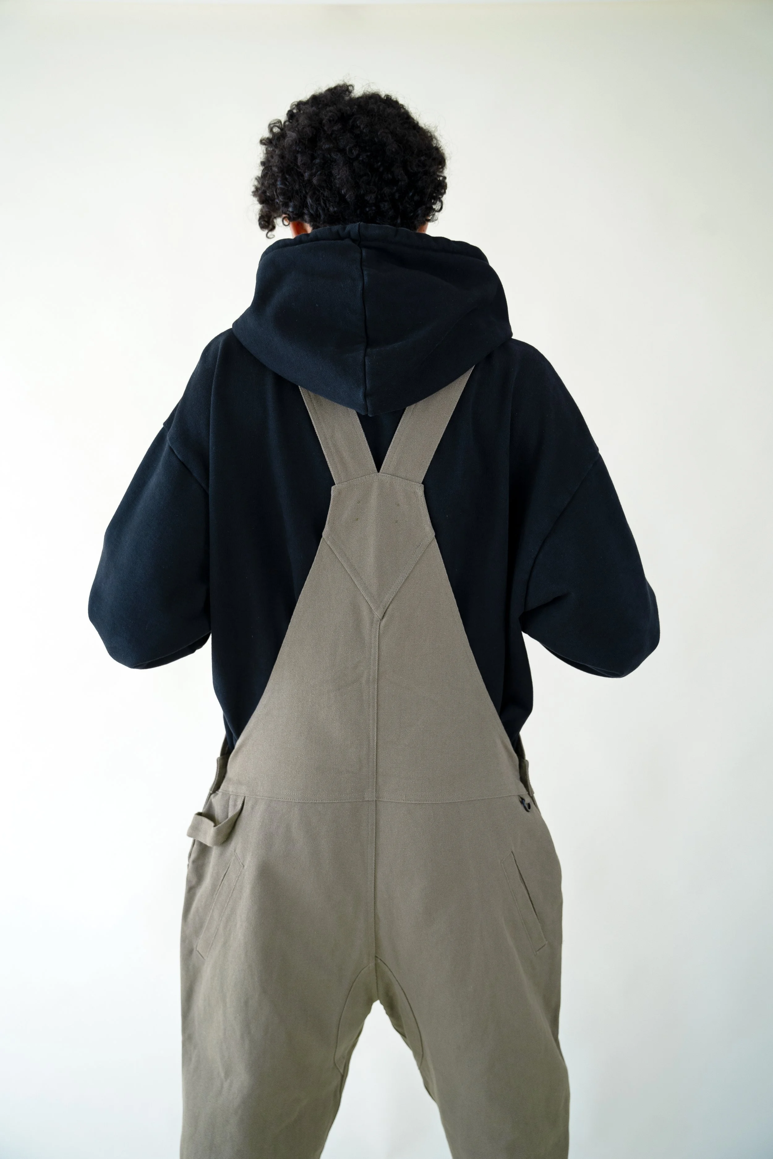 Person facing away, wearing a black hoodie and beige overalls, standing against a plain background. View fullsize