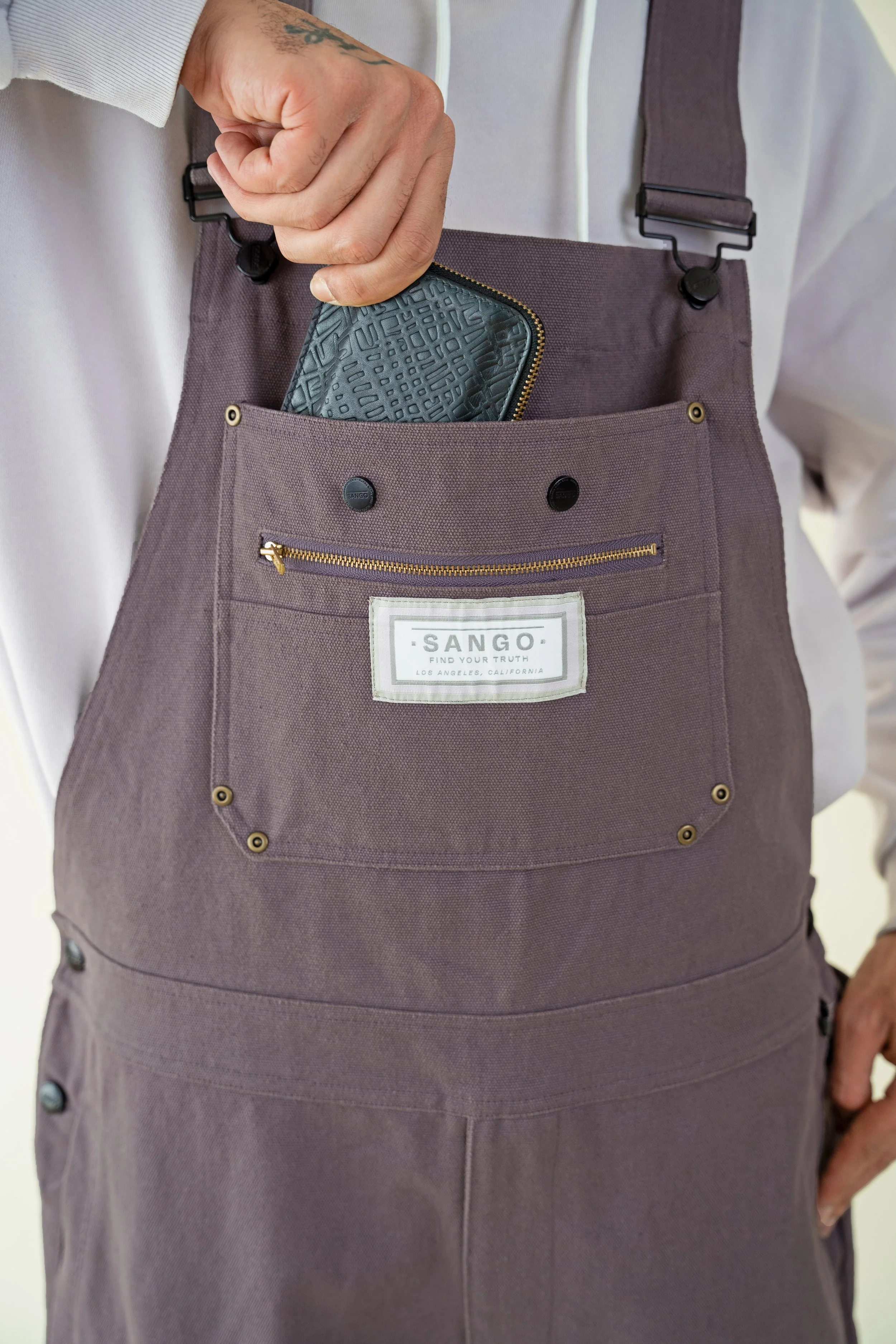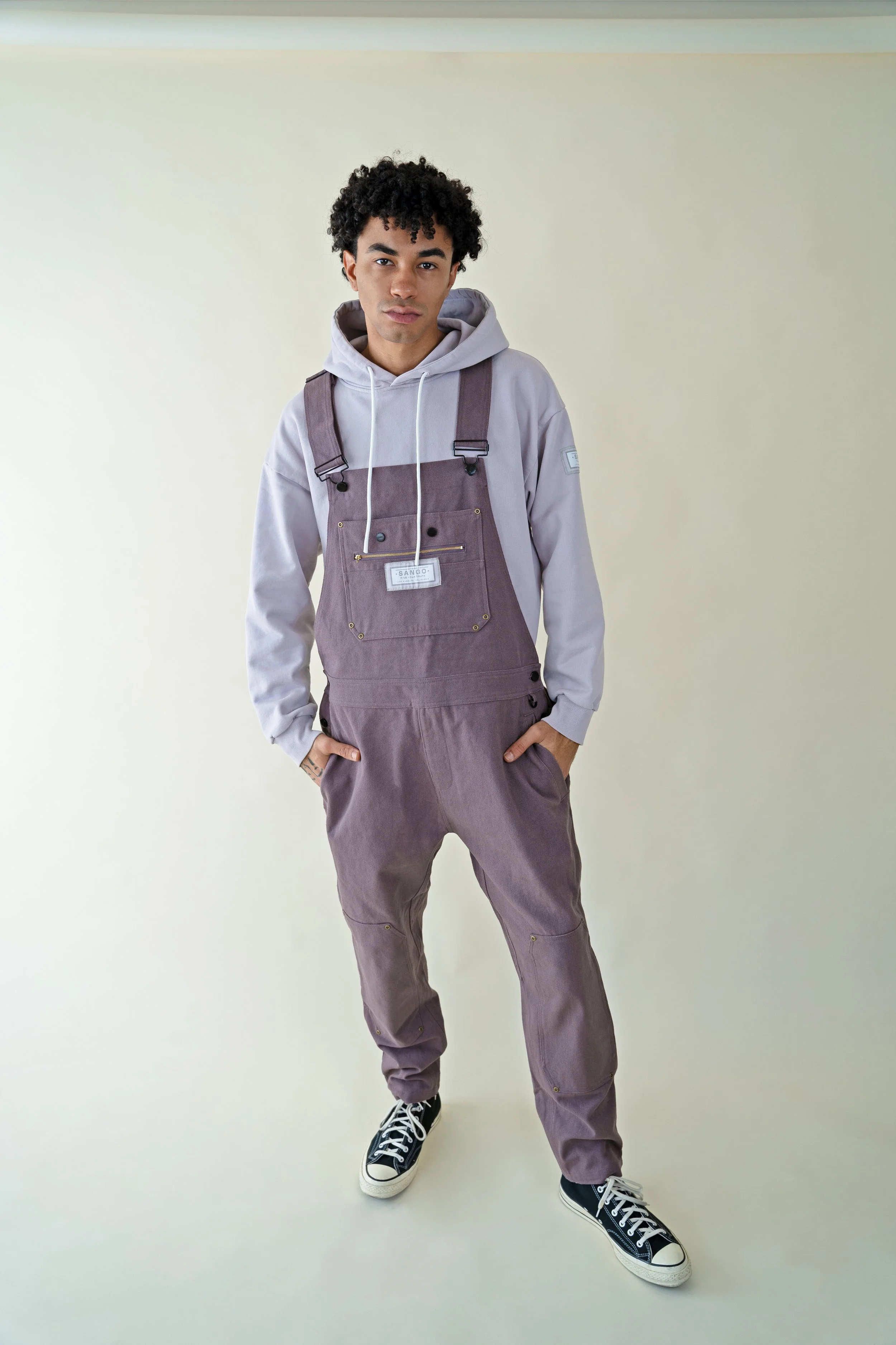 Person wearing a gray hoodie and mauve overalls, with hands in pockets, standing against a light background.